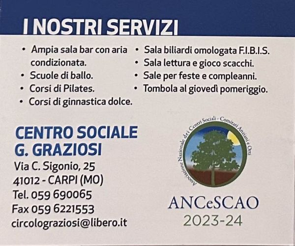 Le attività di uno dei nostri Centri: bravi al CENTRO SOCIALE GRAZIOSI. associato ad ANCeSCAO PROVINCIALE,una bella organizzazione,per essere sempre vicini alla gente, perché anche ballando si fa gruppo. E doppiamente bravi perché si sono dati da fare per trovare chi ti da una mano per far quadrare anche i conti, un grande grazie a chi ha contribuito. Siete tutti invitati, grazie CENTRO SOCIALE G. GRAZIOSI, a Carpi, dai che un po’ di movimento fa sempre bene, un ballo, buona musica, e tanta compagnia!